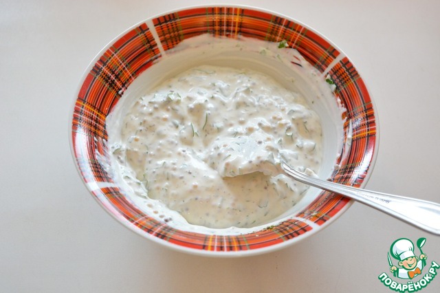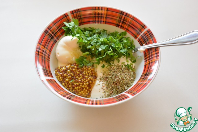 Для соуса-дипа соедините сметану, майонез, измельчённый чеснок, зернистую горчицу, орегано и нарезанную петрушку. По вкусу можно добавить соль