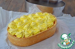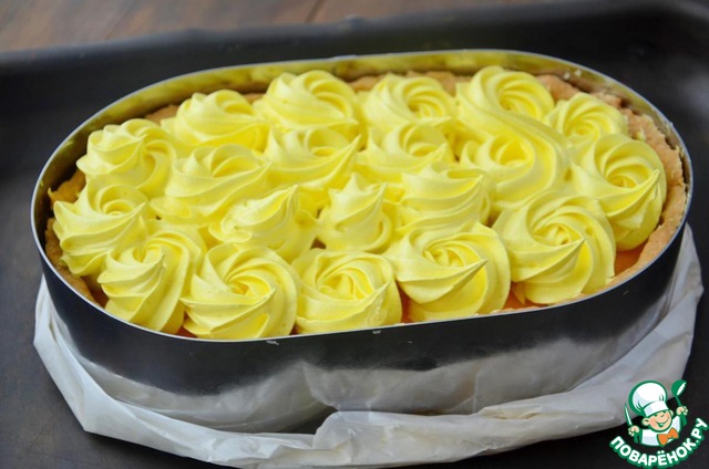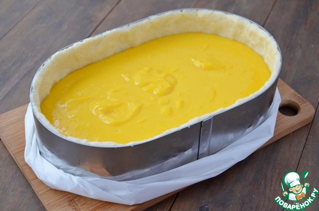 Достать готовый пирог из духовки, температуру духовки убавить до 150 градусов.