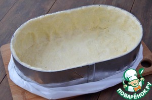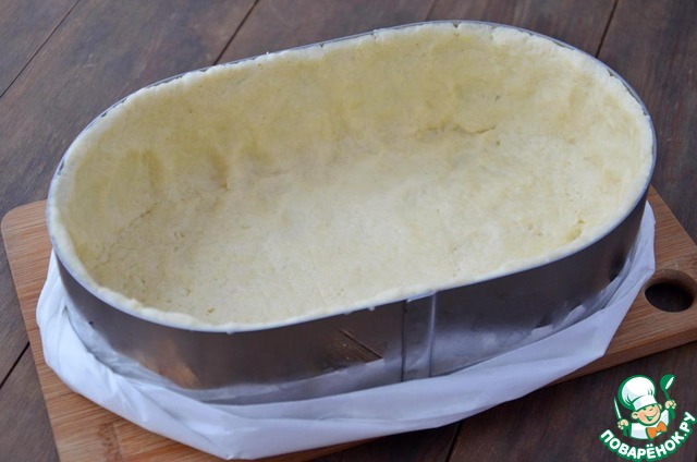 Если любите сладкую основу, то добавьте в тесто немного сахара. Форму застелить пекарской бумагой или смазать... у меня форма без дна, я снизу сделала дно из пекарской бумаги и ничего не смазывала.