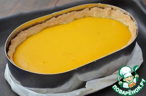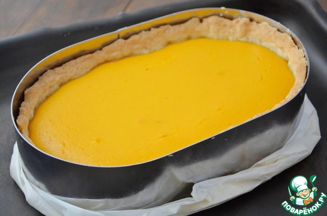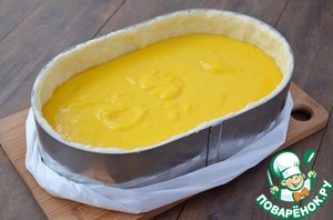 Тесто раскатать между двумя листами пекарской бумаги, аккуратно перенести в форму и распределить, формируя бортики.