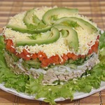 Отварные яйца разделить на белки и желтки. Натереть на мелкой терке в разные чеплашки. Огурец натереть на крупной терке. Помидор и куриную грудку маленьким кубиком. И все по разным тарелочкам.