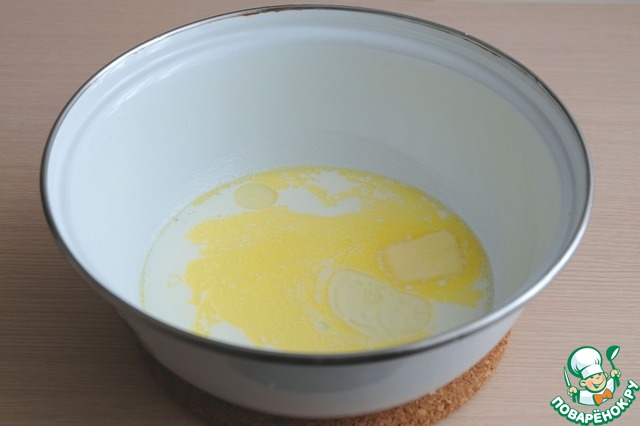 В молоко (200 мл.) добавить сливочное масло (30 гр.), растительное масло (1 ст. ложка), сахар (1 ст. ложка). Смесь подогреть до полного расплавления масла и сахара.