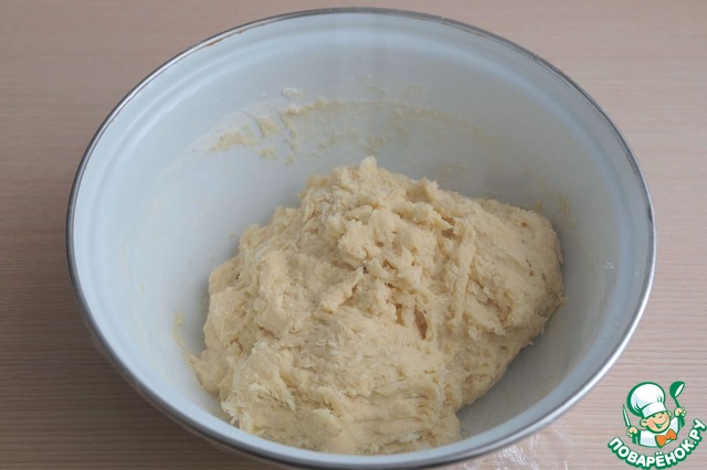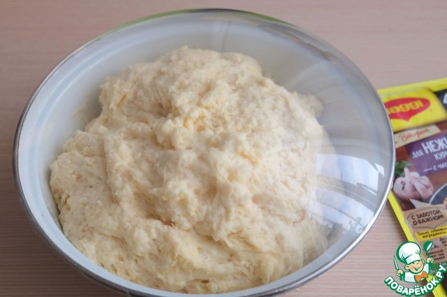 Замесить тесто. Емкость с тестом накрыть пищевой пленкой или полотенцем и поставить в теплое место для подъема.