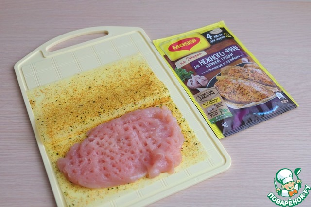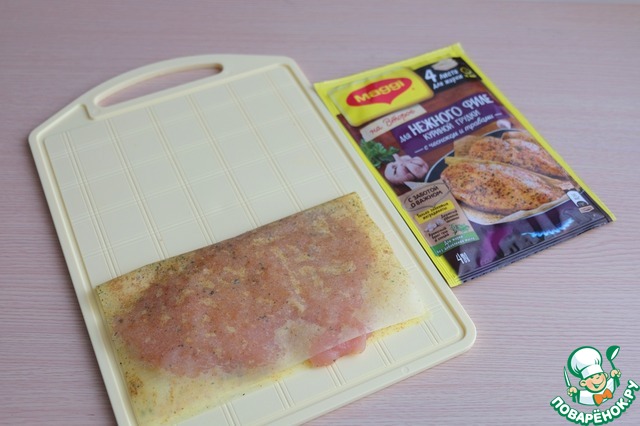 Куриную грудку отбить с двух сторон до толщины 1,5-2 см. Развернуть лист для жарки приправы MAGGI на второе, положить на его половину куриную грудку.