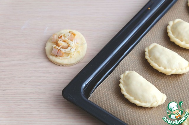 Тесто разделить на равные кусочки. На середину каждого кусочка выложить начинку. Края соединить, скрепить.