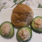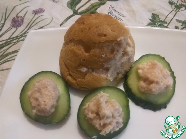 Эта закуска сметается под крепкие напитки на столе за несколько минут. Готовится и того меньше, стол нарядный, можно использовать для фуршетов, т. к. сервируется закусочка порционно. Обычно готовлю в двух вариантах: на поджаренных с одной стороны черных тостиках и в профитролях. Замечено, что дамы предпочитают профитроли, а "брутальные мачо" черные тосты.