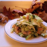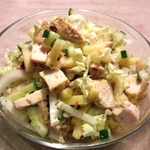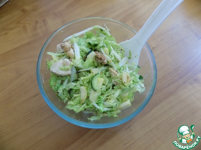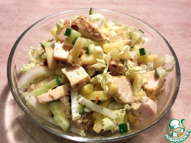Свежий и лёгкий салат с нежным филе куриной грудки, яблоком, пекинской капустой и огурцом, заправлен пикантной заправкой.