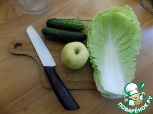 Листья скручиваем "рулончиком" и нарезаем тонкой, длинной "лапшой". Режем огурец и яблоко произвольно. Немного сбрызгиваем яблоко в салатнике лимонным соком, чтобы оно не потемнело, пока мы делаем салат.