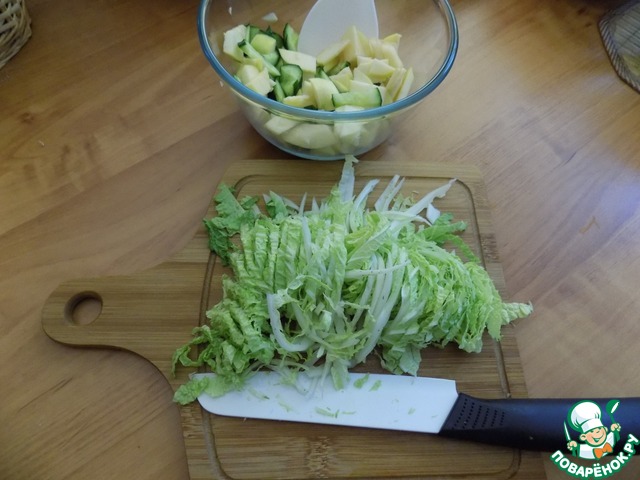 Готовим продукты для салата. Прожилки плотные у листьев пекинской капусты я вырезала.