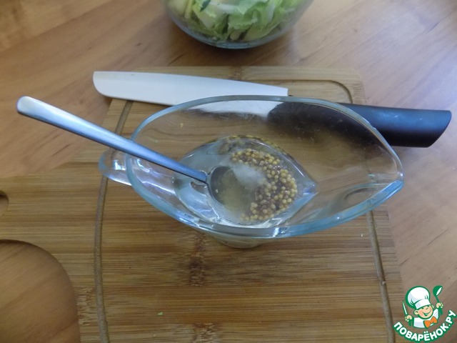 Делаем заправку. Смешиваем масло, горчицу, мёд, лимонный сок и солим по вкусу. Всё перемешиваем.