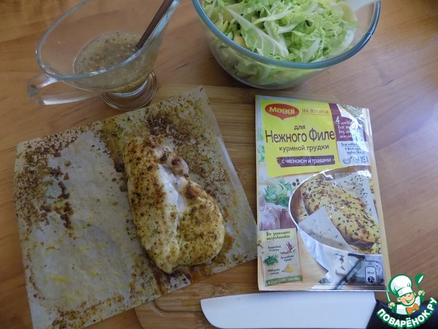 - Приправа (1 лист Maggi для филе нежной куриной грудки с чесноком и травами) — 1 пач.