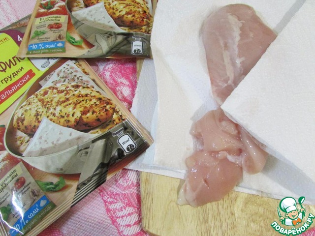 Филе куриной грудки освободить от пленок. Вымыть и хорошо промокнуть бумажной салфеткой.