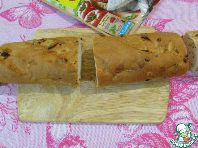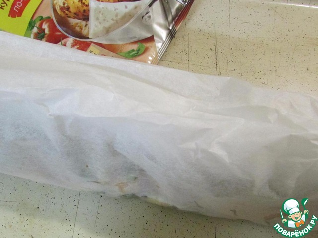 Края пекарской бумаги завернуть конвертиком. Противень отправить в разогретую духовку (180 градусов). Выпекать 15-17 минут. Готовый багет извлечь из духовки. Подавать на стол горячим.