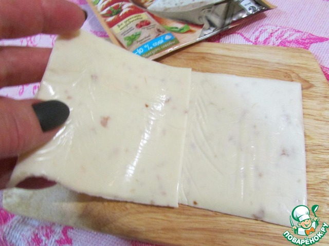 Сырные листы вместе с кусочком курочки свернуть в рулет.