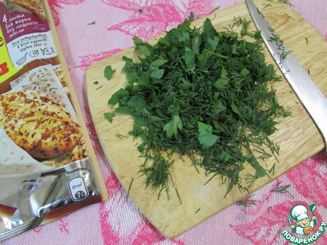 Зелень помыть и хорошо просушить. Затем мелко нарубить.