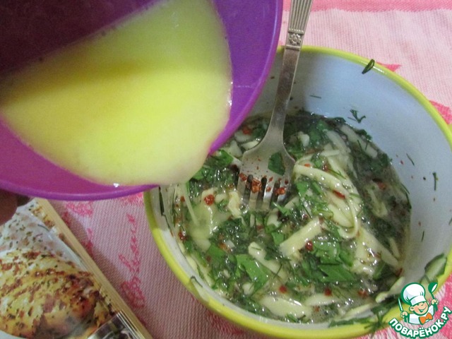 Растопить кусочек сливочного масла, слегка остудить и ввести в сырно-яичную смесь. Хорошо перемешать.