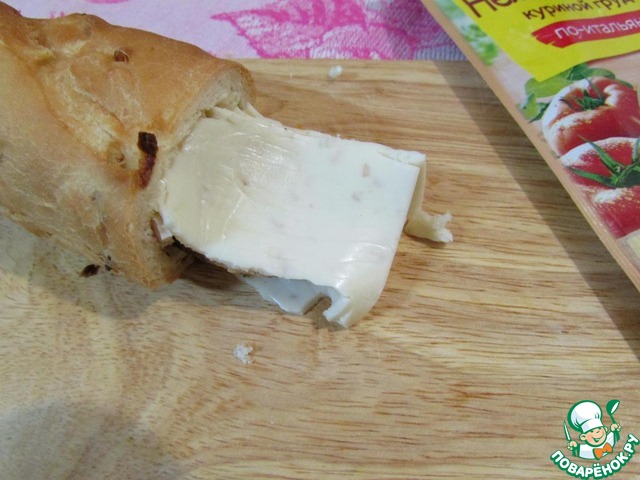 Сырно-куриный рулет вставить в середину багета. Так поступить с каждым кусочком багета.