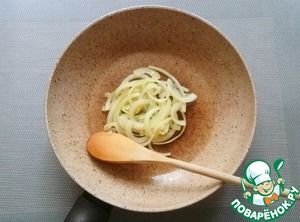 Нарезаем полукольцами лук и слегка обжариваем в масле, после чего лук можно переложить в емкость, освободив сковороду для следующего шага.