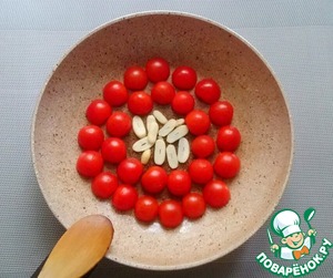 Обжариваем разрезанные пополам помидоры черри и порезанный на кружочки чеснок.