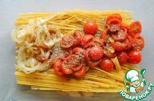 Выкладываем в сковороду спагетти, лук, чеснок и черри, посыпаем базиликом, солью и перцем. В отношении соли будьте аккуратны - если используется бульон и если он достаточно соленый, можно соль не добавлять.