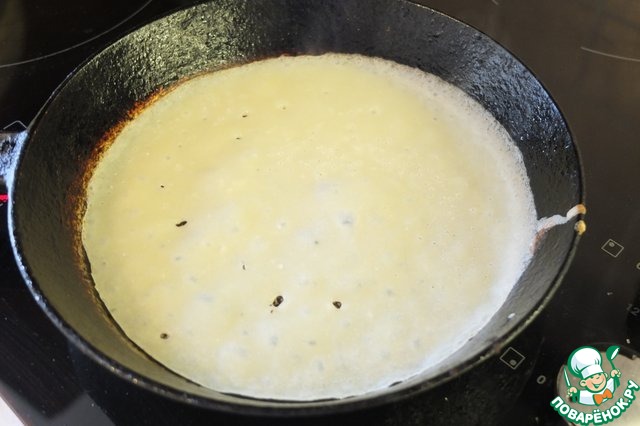 В левой руке я держу сковороду, правой - тоненькой струйкой наливаю тесто, поворачиваю сковородку по кругу против часовой стрелки. Тесто должно растечься тонким ровным слоем.