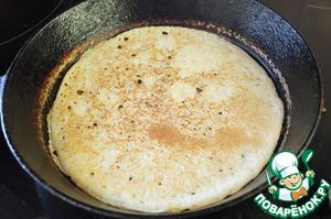 Аккуратно лопаточкой проводим по кругу, отделяя края, и переворачиваем блин. На второй стороне выпекается еще быстрее. Готовность можно проверить, слегка приподняв блин. -