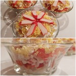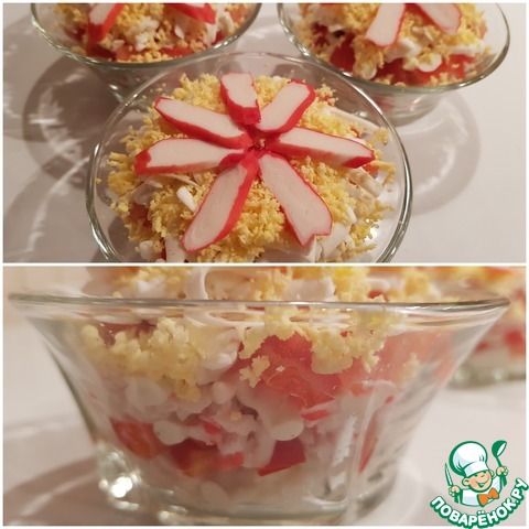 Яйца и перец нарезать маленьким кубиком. Все разложить по разным тарелочкам. Так же кубиком нарезать крабовые палочки, помидор и курочку. Сыр натереть на мелкой терке.