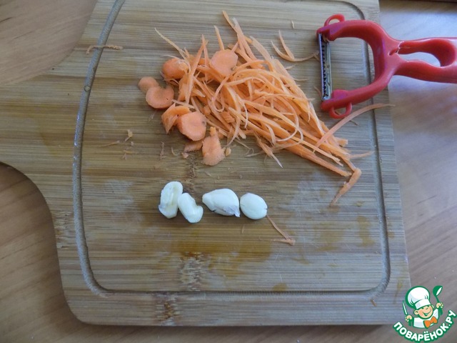 Параллельно делаем овощи. Морковь натираем на тёрке. Чеснок чистим и каждую дольку давим плоской стороной ножа.