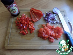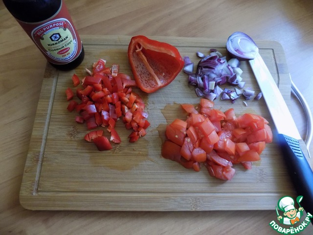 Овощи: помидор, лук красный и болгарский перец режем произвольно, как вы любите.