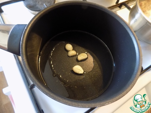 В сотейник наливаем масло, разогреваем его и выкладываем чеснок раздавленный. Делаем чеснок в масле с одну минуту, чтобы он отдал аромат маслу и убираем его.