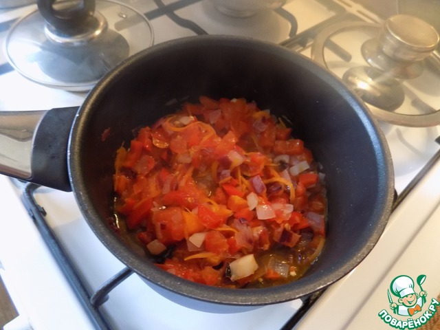 Далее-лук чуть обжариваем и выкладываем помидор, перец болгарский и морковь. Тушим до готовности.