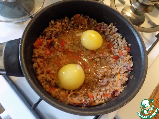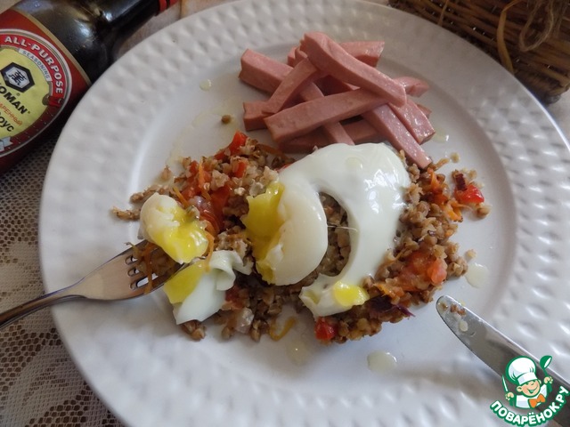 Один из вкуснейших вариантов гречневой каши на завтрак - каша с овощами и глазуньей. Делается просто и быстро. Результат отличный. Вы можете есть кашу просто безо всего или подать к ней ветчину, колбасу, сосиски или мясо.