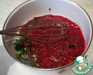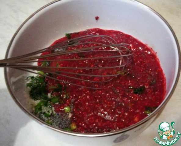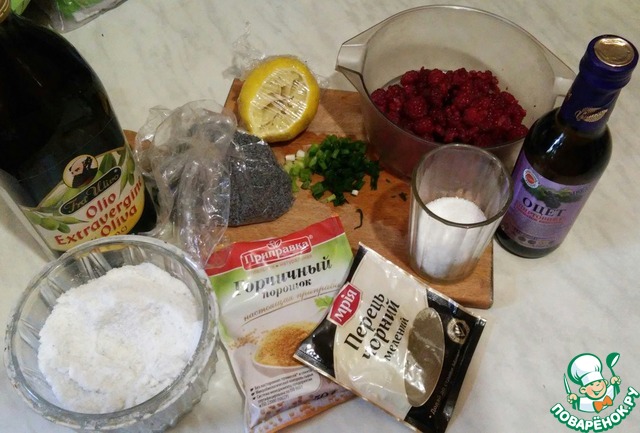 В малину добавляем горчичный порошок, сахар, соль, черный перец, мак, лимонный сок, виноградный уксус, мелко порезаный зеленый лук. Перемешиваем все до однородной консистенции