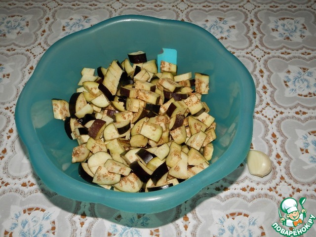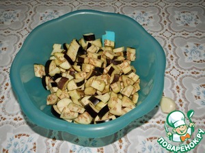 Баклажаны помыть, срезать плодоножку. Нарезать небольшими кубиками. Почистить зубчик чеснока.