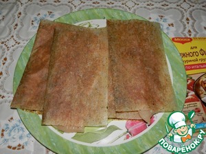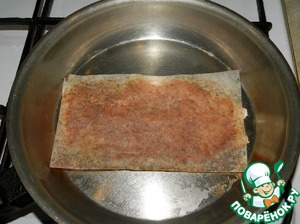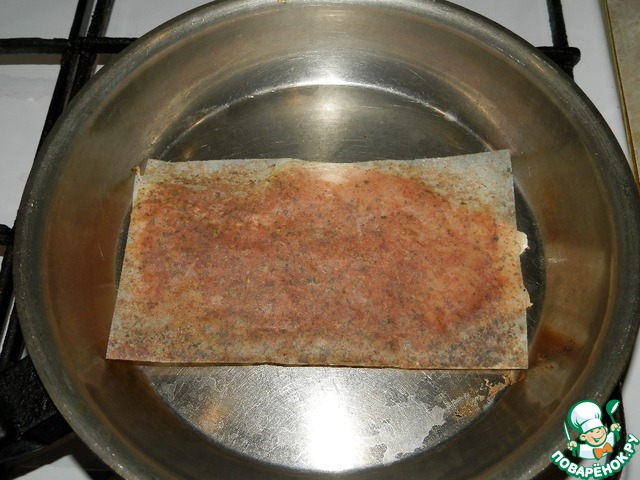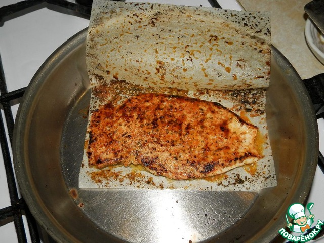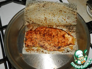 Готовые ломтики филе положить на противень, отвернуть верхние половинки листов бумаги и отрезать их ножницами, чтобы они нам не мешались.