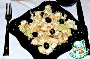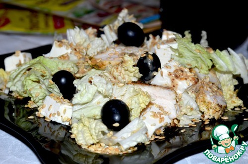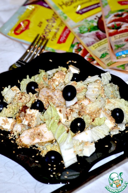 Собираем салат. На тарелку выкладываем пекинскую капусту на нее ломтики курицы, раскладываем брынзу и виноград. Сверху поливаем ореховым соусом и посыпаем кунжутом.