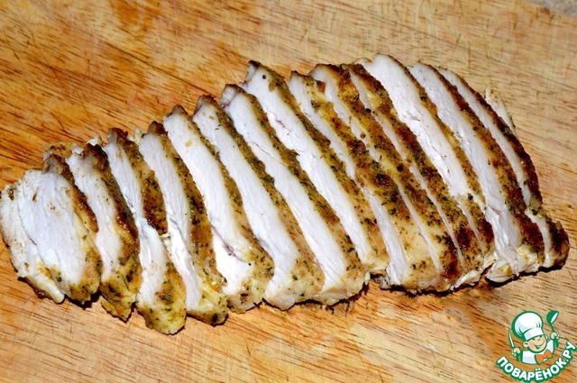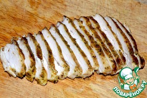 Нарезаем остывшее филе тонкими ломтиками.