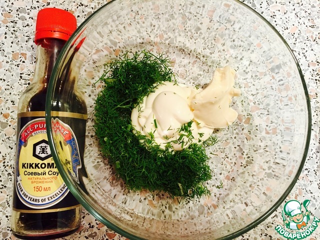 Для соуса смешать майонез, сыр, соевый соус и укроп