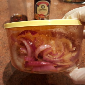 Залить лук заправкой, закрыть контейнер крышкой и хорошенько потрясти.