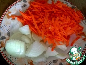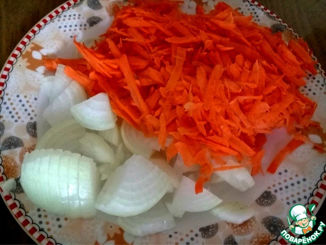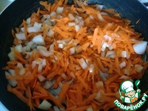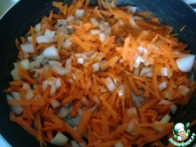 Берем большую сковороду и обжариваем лук с морковью, пассеруем до полной готовности.