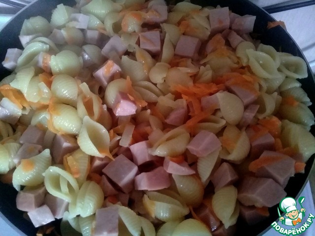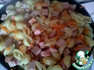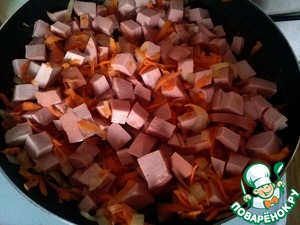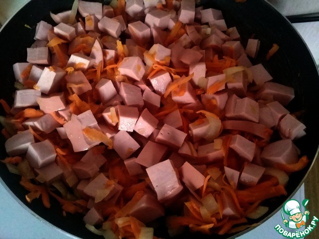 Добавляем колбасу. Немного обжариваем, долго на огне не держим.