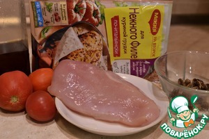 • Смешиваем грибы, филе, помидоры, заливку, даем настоятся минут 15-20 и кушаем