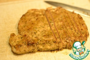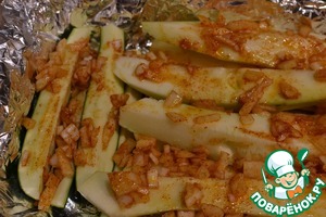 Филе нарезаем длинными полосочками, выкладываем на кабачки, в качестве заправки используем маринад. Даем постоять минут 30 при комнатной температуре