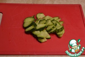 Маринованный и свежий огурцы режем вдоль на 4 части и далее на кусочки
