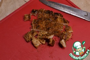 Курочку режем кубиками ( я израсходовала 1/4 от филе), перемешиваем с овощами.