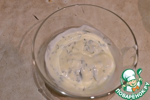 Для заправки мелко режем зелень, смешиваем с майонезом и сметаной, солим и перчим по вкусу.