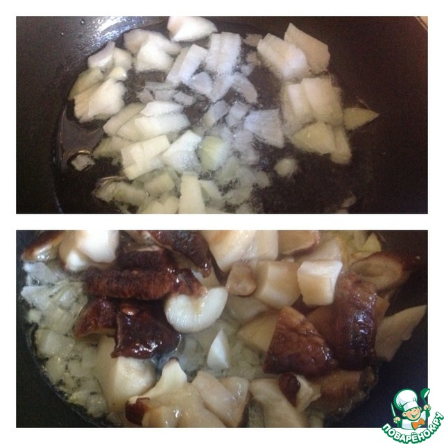 Лук нарезать маленьким кубиком и поставить обжаривать на растительном масле. Когда лук станет уже мягким, добавить нарезанные средним кубиком белые грибы. Присолить и обжарить вместе с луком до готовности.