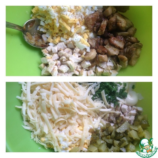 Грудку нарезать не большим кубиком как и огурцы. Сыр натереть на крупной терке, яйца нарезать кубиком. Добавить майонез, остывшие грибы с луком, смесь молотых перцев. Укроп мелко измельчить. Салат перемешать.