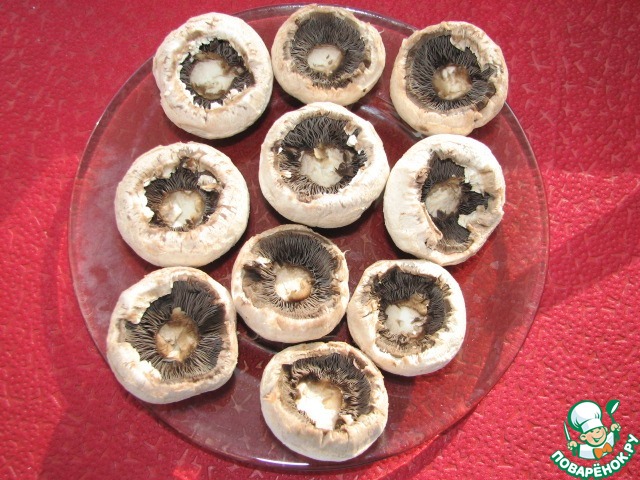 С шампиньонов снять кожицу, вырезать ножки (они нам не понадобятся).