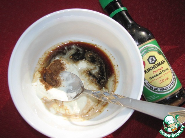 Приготовить маринад: смешать 2 ст. л. соевого соуса, 2 ст. л. сметаны и специи.